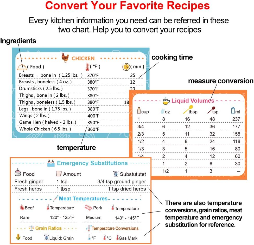 (Curious about which air fryer is right for you?. Air Fryer Magnetic Cooking Times Sheet Handy Time Chart Oven Accessories In Kitchen Magnet flip Frozen Instant Fried Cook temperatures Guide Cookbook for Beginners Description MORE ITEMS UPGRADED Other air fryer cheat sheets, They only list times and temperatures for 60~70 foods. Whether you use your air fryer for chicken, vegetables or cakes we hope you find this air fryer recipe conversion tool helpful Please leave any comments at the bottom, your feedback is appreciated We are developing more air fryer cooking charts If you have any requests, please tell us below Useful air fryer cooking charts.