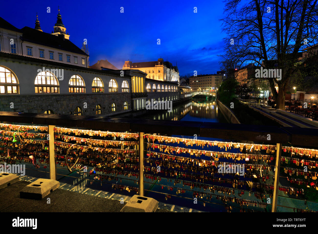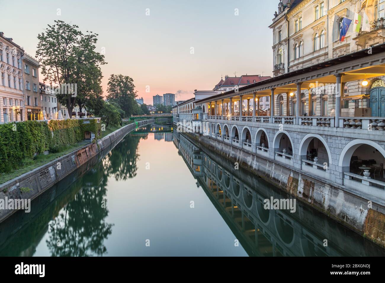 Il Mercato Centrale Di Edifici Si Riflette Nel Fiume Ljubljanica Al Crepuscolo Citta Di Lubiana Slovenia Europa Foto Stock Alamy