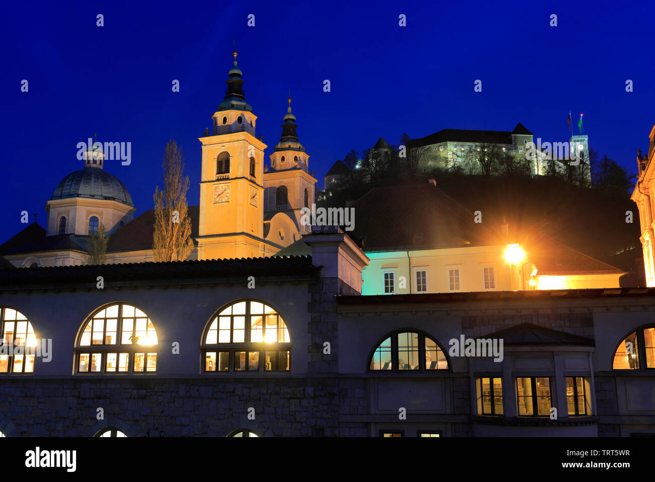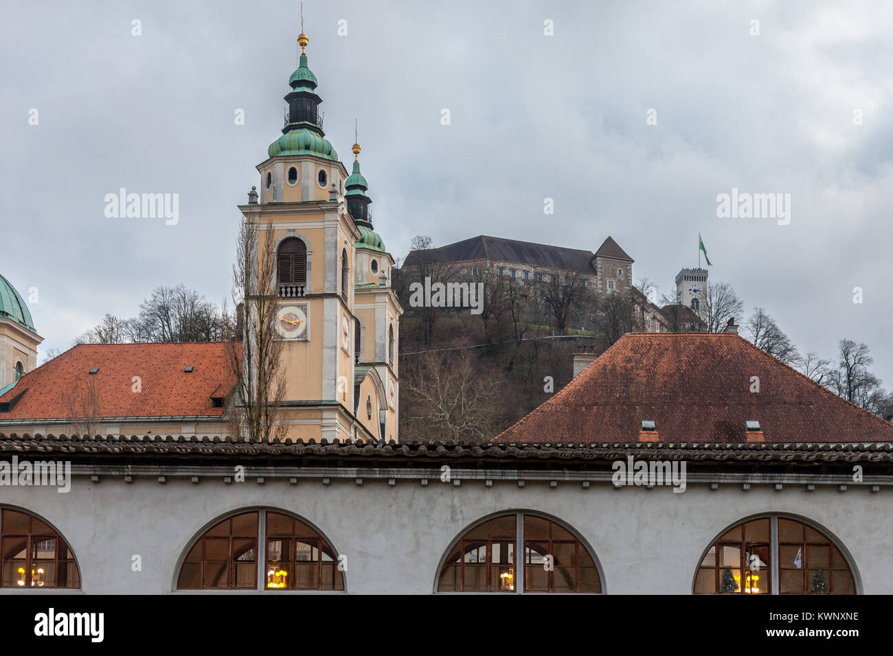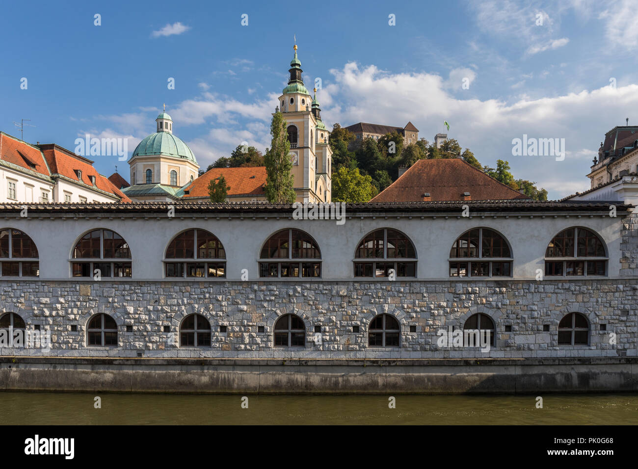 Mercato Centrale Di Lubiana Progettato Dall Architetto Sloveno Joze Plecnik Cattedrale Di San Nicola E Il Castello Di Ljubljana In Background Foto Stock Alamy