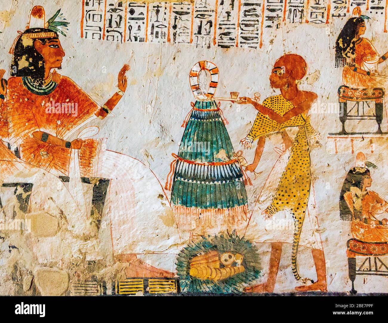Letti da banchetto (klìnai) tutt’intorno alla tavola su cui venivano a celebrare i parenti del defunto L’antichità di questi usi funerari è attestata dal fatto che, talvolta, attorno alla tavola funebre si trovano sedie (e non letti), eredità di epoche in cui non si mangiava ancora sdraiati. Il nuovo rito funebre era destinato alle persone del popolo;. Altri reperti Altri reperti pervenuti, sempre dalle pareti della tomba, rappresentano scene di vita quotidiana, anche queste uniche nella loro bellezza pur trattandosi di una semplice ispezione ai bovini e censimento delle oche eseguiti da uno scriba nella proprietà di Nebamon ma dove gli animali sono raffigurati con estremo realismo ed ogni vacca è diversa dall'altra nella pezzatura.