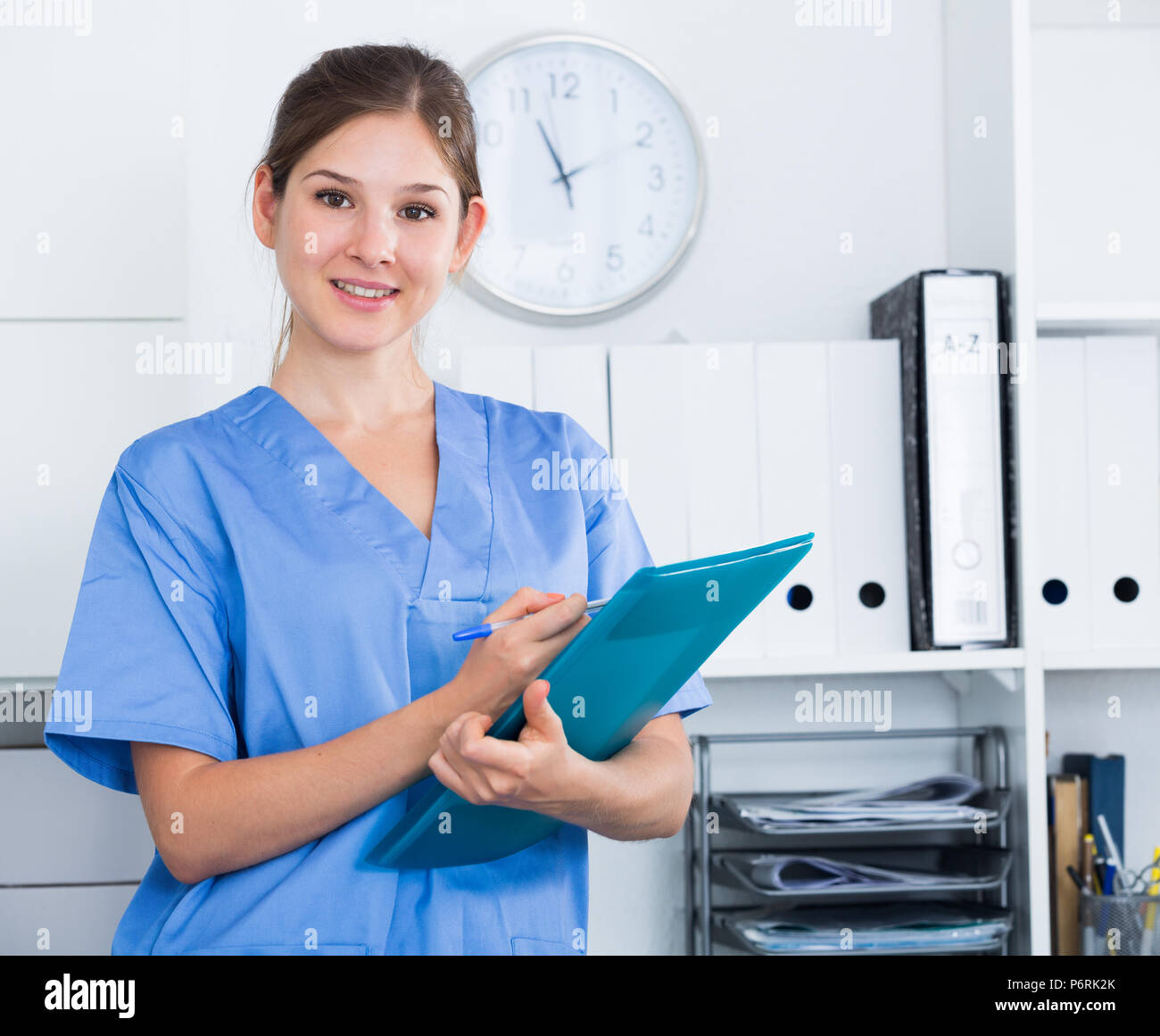 Giovane Assistente Medico In Piedi In Ufficio Medico Osservando Le Prescrizioni Foto Stock Alamy