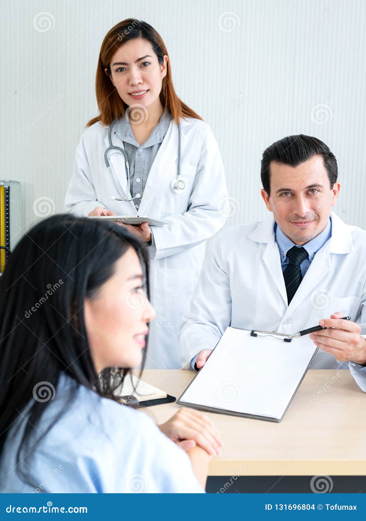 Medico Sorridente E L Assistente Medico Ciao Il Paziente Fotografia Stock Immagine Di Exam People