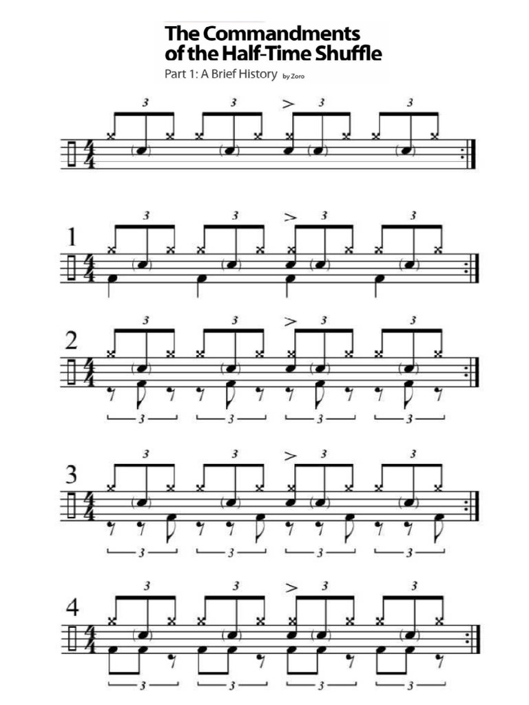 This month we’re tackling a groove that has confounded drummers for more than forty years The halftime shuffle This groove’s ghost note placement has been a mystery to many drummers since legends such as Bernard Purdie, John Bonham, and Jeff Porcaro first laid it down in the late ’70s and early ’80s In this lesson we’ll explore this pattern with fresh eyes and ears Let’s dig in!. Description The Commandments of the HalfTime Shuffle is the first book dedicated exclusively to learning about and playing the halftime shuffle Complete with historical analysis and overviews of the lineage of the style, the book will equip drummers with all of the necessary tools needed to conquer one of the most beloved, yet mystifying, grooves in drumming history. The HalfTime Shuffle by Dave Beyer Variations on One of Drumming’s Slinkiest Grooves The halftime shuffle is a signature beat for some of the most legendary drummers in history Guys like Bernard Purdie, John Bonham, and Jeff Porcaro are all considered masters of this feel Let’s take a look at how each of these players customized the.