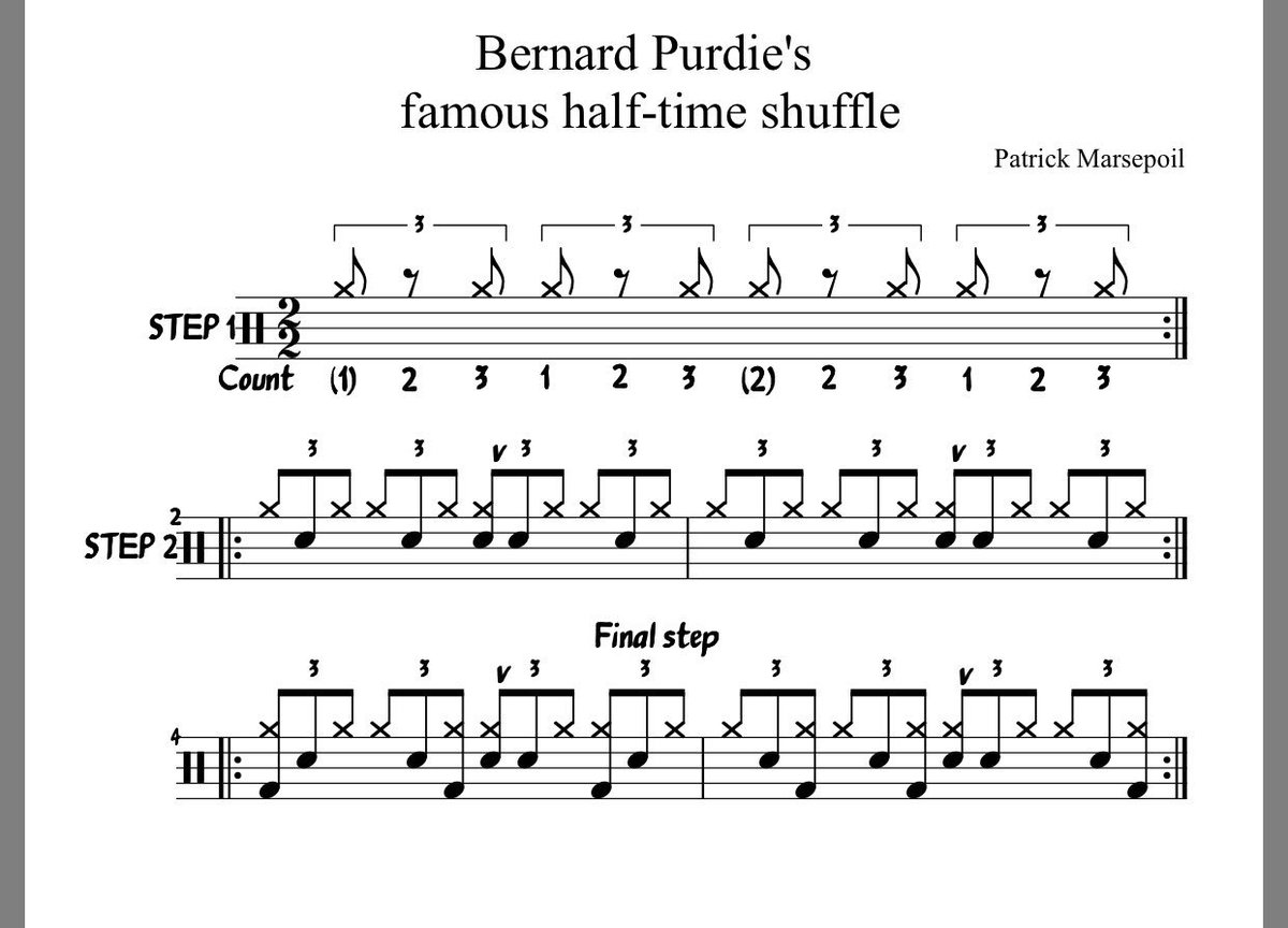 This month we’re tackling a groove that has confounded drummers for more than forty years The halftime shuffle This groove’s ghost note placement has been a mystery to many drummers since legends such as Bernard Purdie, John Bonham, and Jeff Porcaro first laid it down in the late ’70s and early ’80s. A halftime shuffle has two requirements it must have 1 a shuffle feel (1st and 3rd triplet swing feel etc) and 2 it must have a "halftime back beat feel If it's a 18th note shuffle feel then instead of backbeats on 2 and 4, the back beat would be on 3 If it's a 16th note shuffle feel, then the backbeats would be on 2 and 4 (not the "and's") I believe, that's it The PurdieRosanna shuffle is a half time shuffle. The Purdie shuffle is a halftime groove, so I thought the best way to write it was as 8thnote triplets with the backbeat on 3 Here’s the basic hihat and snare drum pattern Adding the bass drum gives you a basic halftime shuffle—a great groove in itself I usually keep both heads on the kick to get an open.