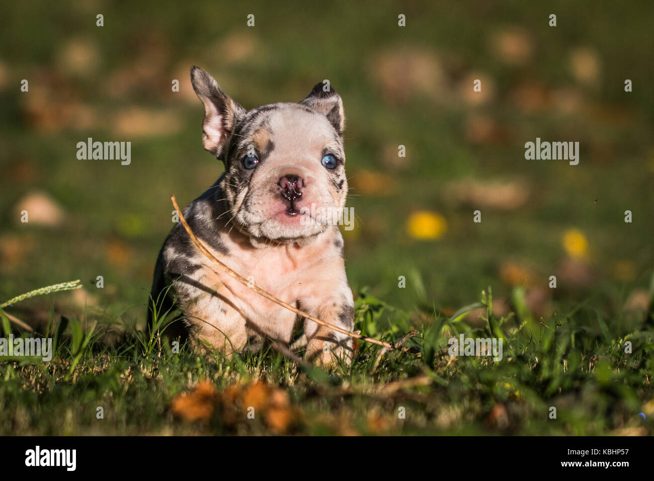 La Foto In Orizzontale Di Un Merle Colorato Bulldog Inglese Cucciolo Con Luminosi Occhi Blu Acceso In Verde Erba Verso La Telecamera Foto Stock Alamy