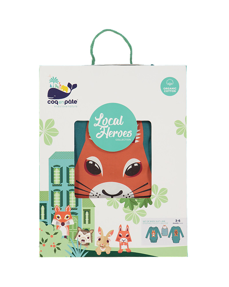Coq En Pate Set Body Maniche Lunghe E Bavaglino Scoiattolo Verde Petrolio 100 Cotone Bio Unisex Bambini