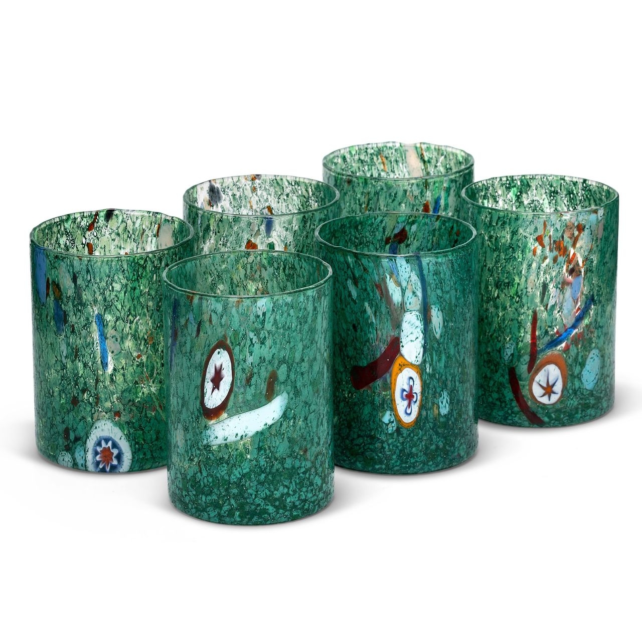 Set Di Bicchieri Set 6 Bicchieri In Vetro Soffiato Verde Petrolio Con Murrine Stile Murano