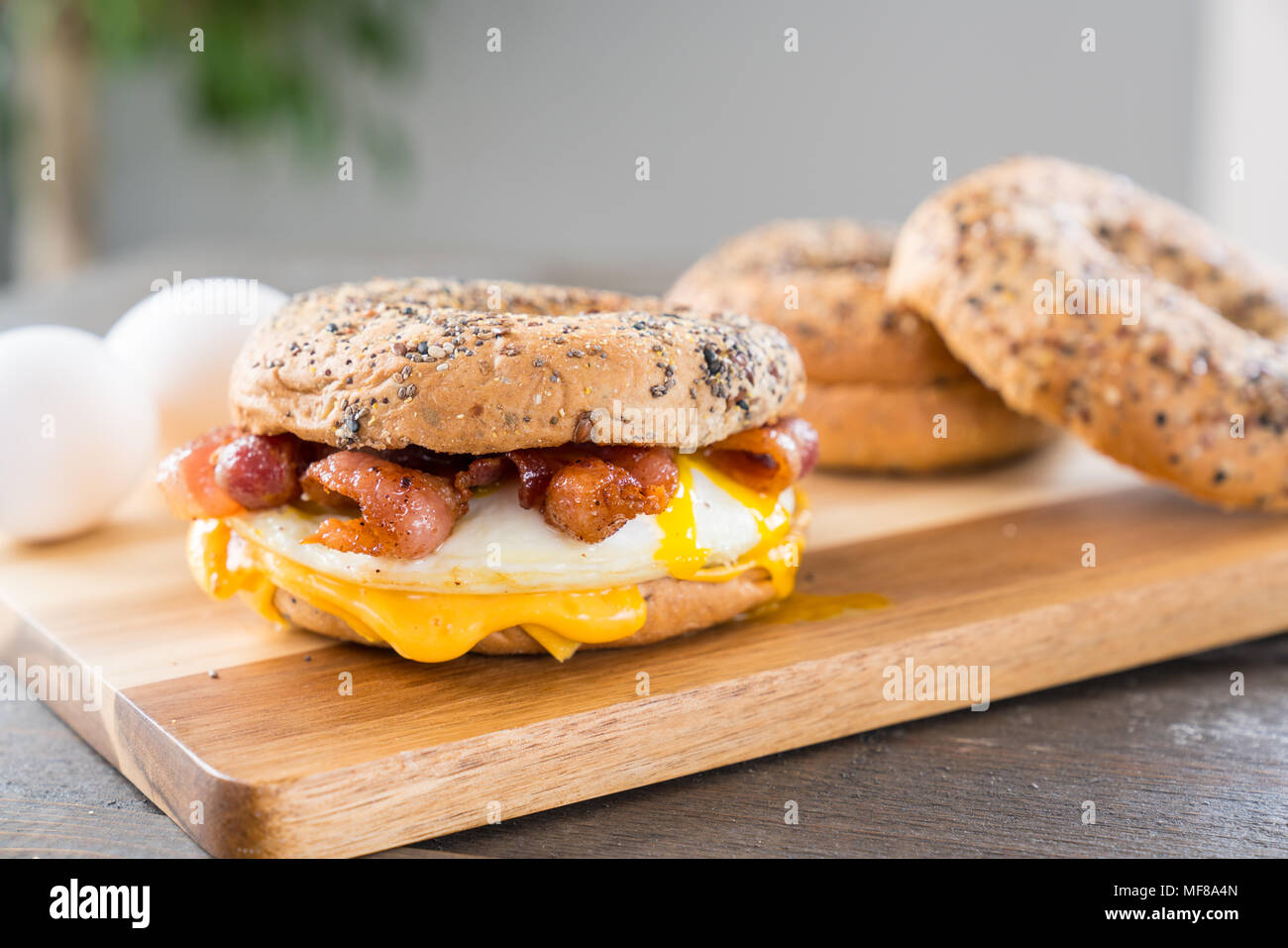Bacon Uova E Formaggio Colazione Panino Con Un Bagel Tutto Sul Bordo Di lio Foto Stock Alamy