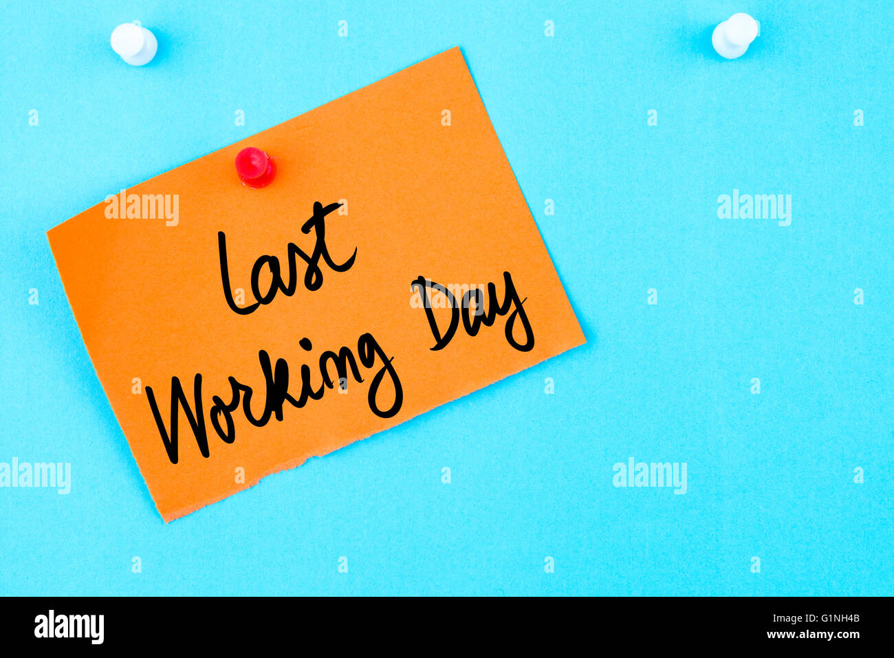 Ultimo Giorno Di Lavoro Scritto Su Carta Arancione Nota Appuntata Sulla Bacheca Di Sughero Con La Puntina Bianca Copia Dello Spazio Disponibile Foto Stock Alamy