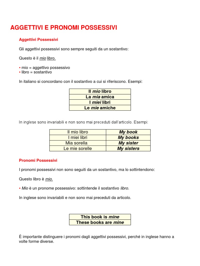 Gli Aggettivi E I Pronomi Possessivi In Italiano Colanguage