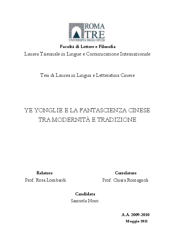 Facolta Di Lettere E Filosofia Laurea Triennale In Lingue E Comunicazione Internazionale Tesi Di Laurea In Lingua E Letteratura Cinese Ye Yonglie E La Fantascienza Cinese Tra Modernita E Tradizione Relatore Correlatore