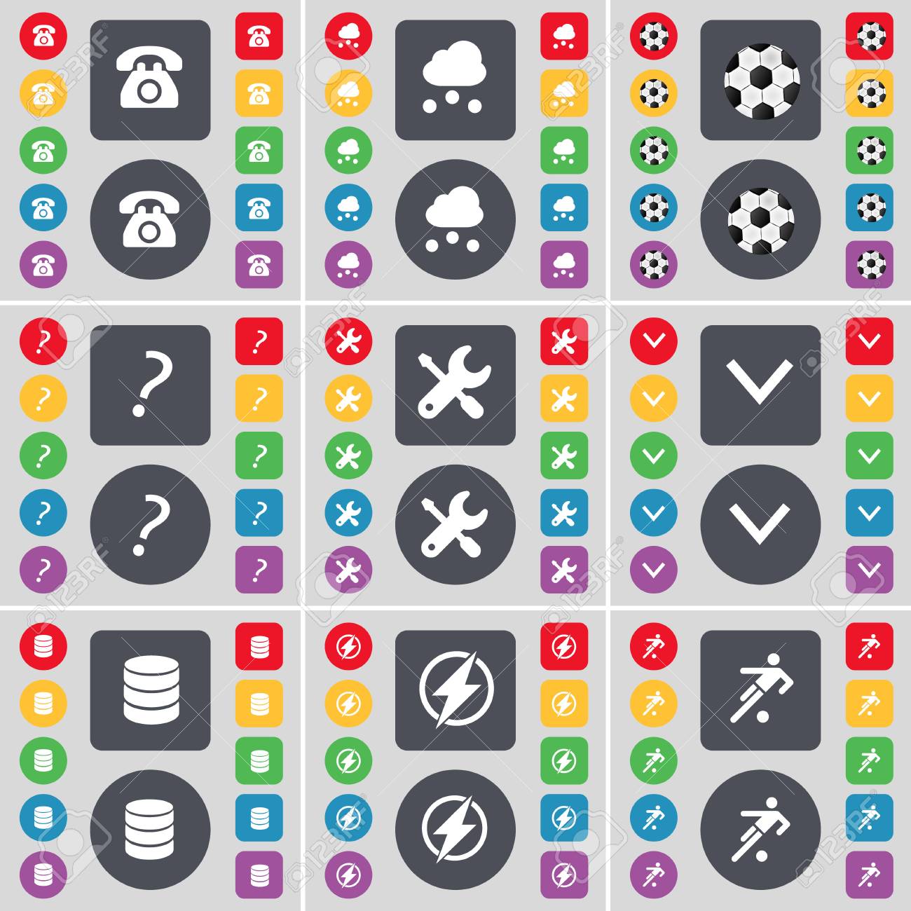 Immagini Stock Retro Telefono Nuvola Palla Punto Interrogativo Chiave Inglese Freccia Giu Database Flash Silhouette Icona Simbolo Un Grande Set Di Bottoni Colorati E Piatti Per Il Tuo Design Illustrazione Image