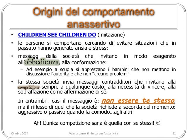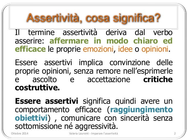 COMUNICAZIONE ASSERTIVA Slide ricavate da Valeria Laurenti, training «Imparare l'Assertività» per «vivere la libertà» (14). LA COMUNICAZIONE ASSERTIVA IN AMBITO SCOLASTICO Cosa vuol dire assertività Il termine “assertività” indica uno stile comportamentale caratterizzato dalla possibilità di scegliere liberamente come agire, in relazione ai propri desideri e bisogni e contemporaneamente nel rispetto dei diritti delle altre persone Evidentemente, si tratta di. Esempi di comunicazione assertiva, passiva e aggressiva A cura della dottssa Chiara Rossi Urtoler, Psicoterapeuta a Modena.