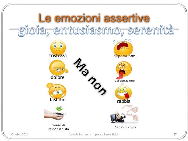 Esercizio n2 per distinguere i sentimenti da altre forme di comunicazione NB Il secondo elemento della CNV consiste nell’esprimere i nostri sentimenti Sviluppando un vocabolario affettivo che ci permetta di descrivere chiaramente e precisamente le nostre emozioni, possiamo stabilire più facilmente un legame con gli altri. L’assertività è una caratteristica del comportamento di un individuo e coincide con un metodo di comunicazione chiaro ed efficace, in cui il soggetto riesce ad esprimere i propri pensieri e le proprie opinioni senza essere aggressivo o offensivo nei confronti dell’altro interlocutore. Assertiva è il partner per la comunicazione d'impresa promozionale, organizzativa e formativa Assertiva is your partner for company communication promotional, organizational and formative Annuccia diventa un' assertiva e combattiva leader di un gruppo di ecologisti e a scuola ottiene notevole successo tra i compagni.