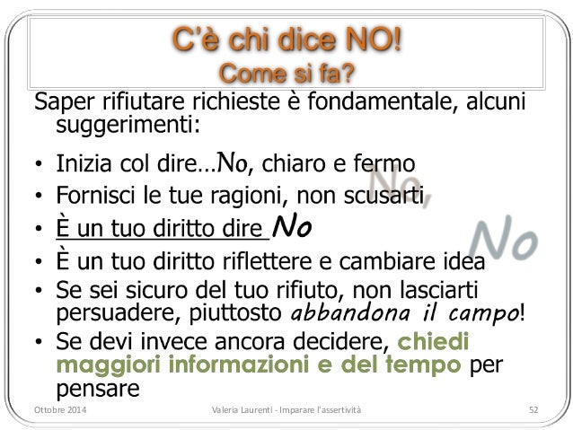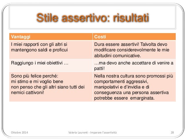 Comunicazione Assertiva Lo stile assertivo è convenzionalmente posizionato tra i primi due, anche se in realtà è uno stile di comunicazione specifico La comunicazione assertiva si basa su diverse abilità che permettono di stare meglio con se stessi e con gli altri Corrisponde alla capacità di saper comunicare i propri sentimenti (sia. Comunicazione assertiva 15 Tecniche efficaci (con esempi) il comunicazione assertiva è la capacità di rispettare gli altri e di essere rispettati dagli altri sulla base del linguaggio e dell'atteggiamento verbale, non verbale. Http//wwwcomunicareconvincerecom Autostima e linguaggio del corpo L'assertività, la passività e l'aggressività nella comunicazione efficace, persuasiva,.