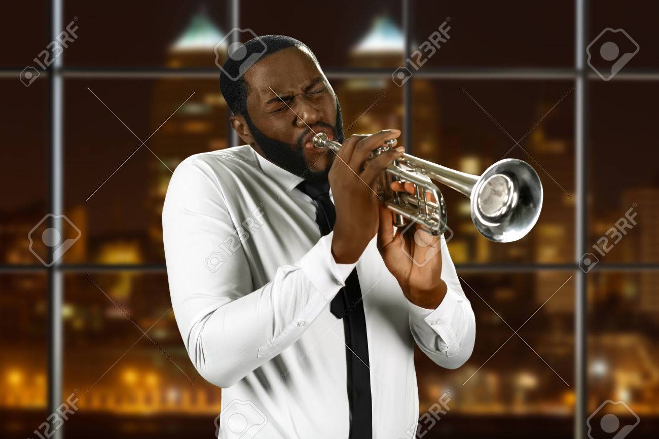 Immagini Stock L Uomo In Camicia Suonare La Tromba Il Trombettista Nero Nella Citta Di Notte Concerto Per Gli Amanti Del Jazz Performance Live Di Musica Impressionante Image