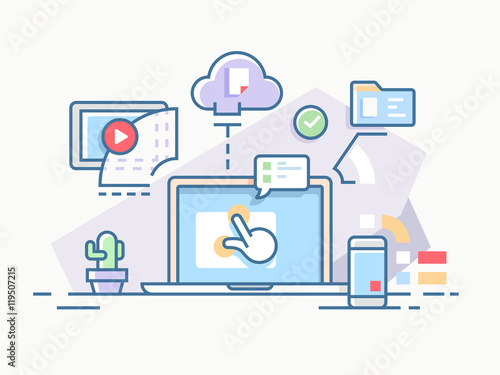 Interactive Workflow Process Using Computers And Cloud Services Vector Illustration Buy This Stock Vector And Explore Similar Vectors At Adobe Stock Adobe Stock