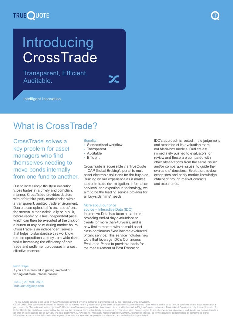 About CrossTrade Capital CrossTrade Capital is #1 best investment platform Across each of our traditional investment areas we have established a general approach to environmental, social and corporate governance CrossTrade Capital are signatories to initiatives such as the Principles for Responsible Investment. (9th proof) 1 Proof 8 1 Another successful cross trade I went first I gave them 35 k bbc and they gave me a turtle and a lynx!. A cross trade occurs when a broker executes an order to buy and sell the same security at the same time, in which both the buyer and seller are clients of the broker A Cross Trade is represented by XT in the course of sales If your order has been cross traded you will be able to view this on your confirmation contract note where it will be stated as 'Crossed Trade'.