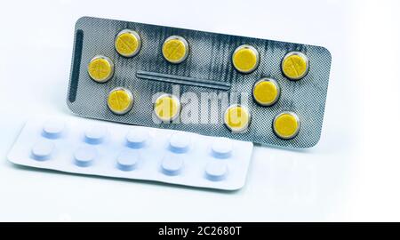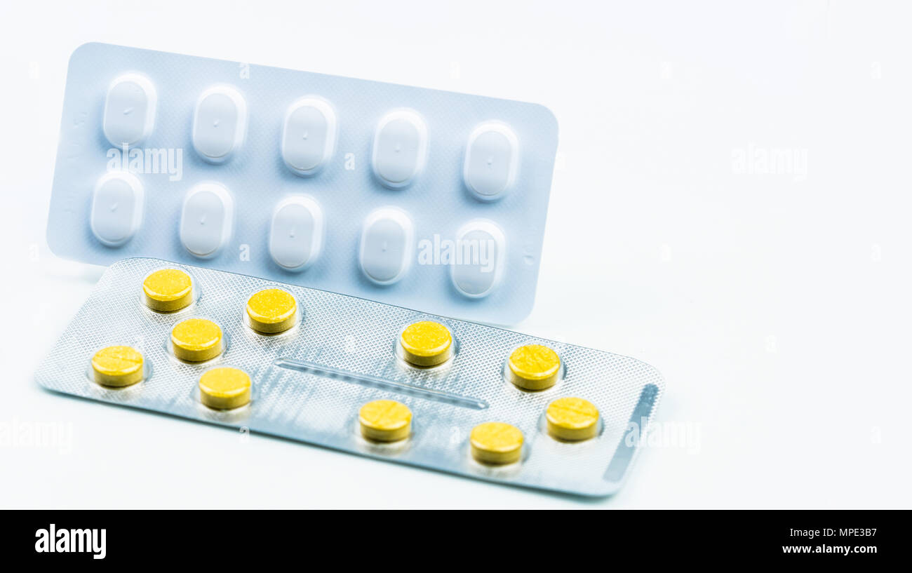 Ergotamina Interazioni Farmacologiche Concetto Compressa Giallo Pillole E Bianco Confezione Blister Il Mal Di Testa Di Emicrania Il Trattamento Con Le Pillole Industria Farmaceutica Bac Foto Stock Alamy