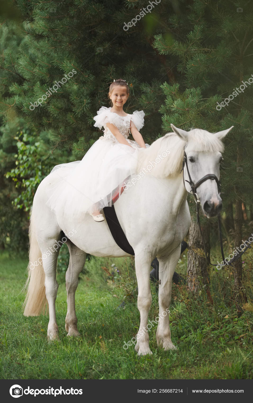 Happy Little Princess On White Horse In The Forest Stock Photo C Ababaka