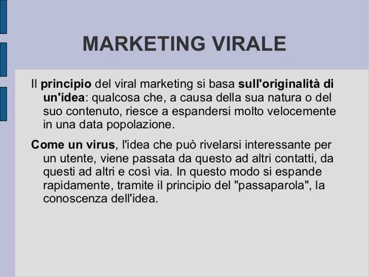 Viralabit Formule Esplosive per il Viral Marketing Home;. Marketing virale definizione ed esempi Per definizione il viral marketing (la cui traduzione non è altro che marketing virale) si basa su qualcosa che si diffonde velocemente e senza controllo Si tratta dell’insieme di tutte quelle attività non convenzionali,. 28mag Viral marketing Visualizza altre idee su marketing, infografica, social media.