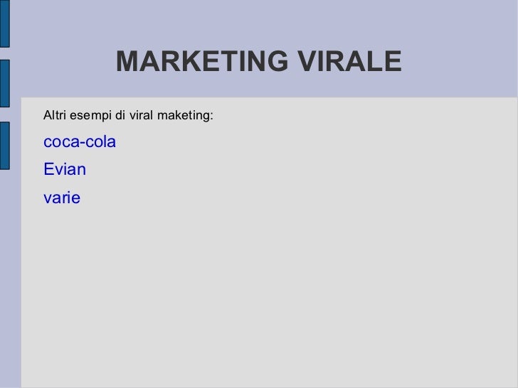 1 Canadian Tire “Wheels” Campaign At the heart of every viral marketing success is the ability to engage the 2 CocaCola “Small World Machines” Campaign Launched in 13, CocaCola’s “Small World Machines” campaign sought out 3. Questa tecnica appartiene a quel campo cosiddetto del marketing “non convenzionale”, ovvero “una strategia di vendita basata su tecniche di comunicazione innovative che presenta i prodotti al pubblico in maniera alternativa” Il viral marketing nasce dal web e dagli strumenti che questa piattaforma mette a disposizione, la modalità di diffusione del. Esempio di soft viral marketing In genere il viral marketing deve contenere immagini e/o scene che colpiscano talmente tanto l'utente, che questo in modo de.