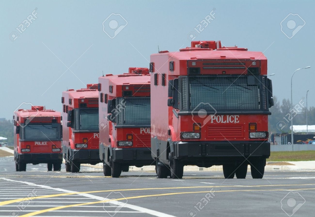 Immagini Stock Quattro Blindati Camion Rosso Di Polizia Forze Speciali Antisommossa Per Ecc Profondita Di Campo Con Le Due Prime Auto A Fuoco Image