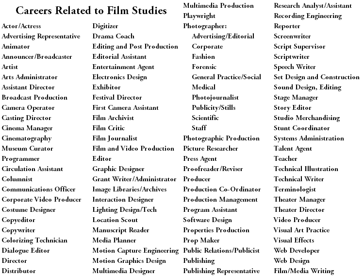 Your media arts degree salary could be as varied as the number of jobs available to media studies majors A film studies salary, for example, can differ some positions, such as film producers, don't have set salaries, but make a percentage of a movie's profits Other positions, such as writers, make a onetime sum for selling a script. The Best Careers in the Film Industry 1 Actor / Actress If you have a passion for performing, you can make a script come to life through your plausible 2 Location Manager Location managers are responsible for finding the perfect location for specific scenes and getting 3 Set Decorator. WELCOME TO THE DEPARTMENT OF FILM AND THEATRE Our two major programs ( RadioTVFilm and Theatre Arts) prepare students for careers as actors, performers, directors, script writers, producers, designers, technicians, managers, and scholarly/critical writers We offer training and experience in radio, television, film, and theatre production as well as courses in the history, scholarship, and aesthetics of these media.