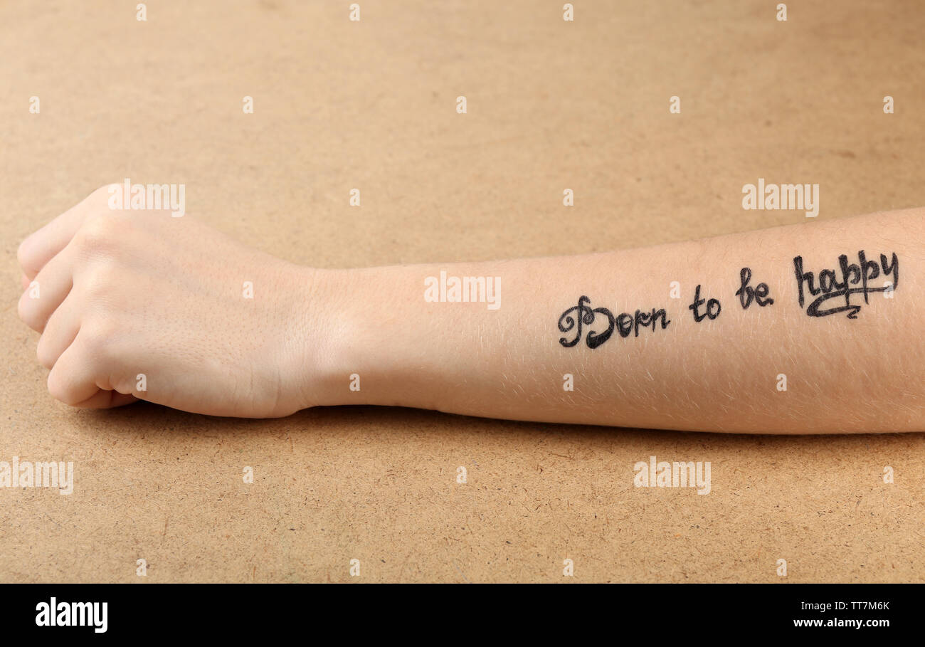 Braccio Femmina Con Tatuaggio Su Sfondo Di Legno Foto Stock Alamy