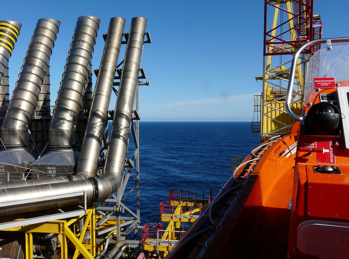 To Personer Har Tatt Plass I Mob Baten Pa Draugen Og Skal Heises Pa Sjoen Ved Hjelp Av En Krane Fin Utsikt Fra Baten Merk Avgassrorene Fra Gassturbinene Ombort Til Venstre Norsk