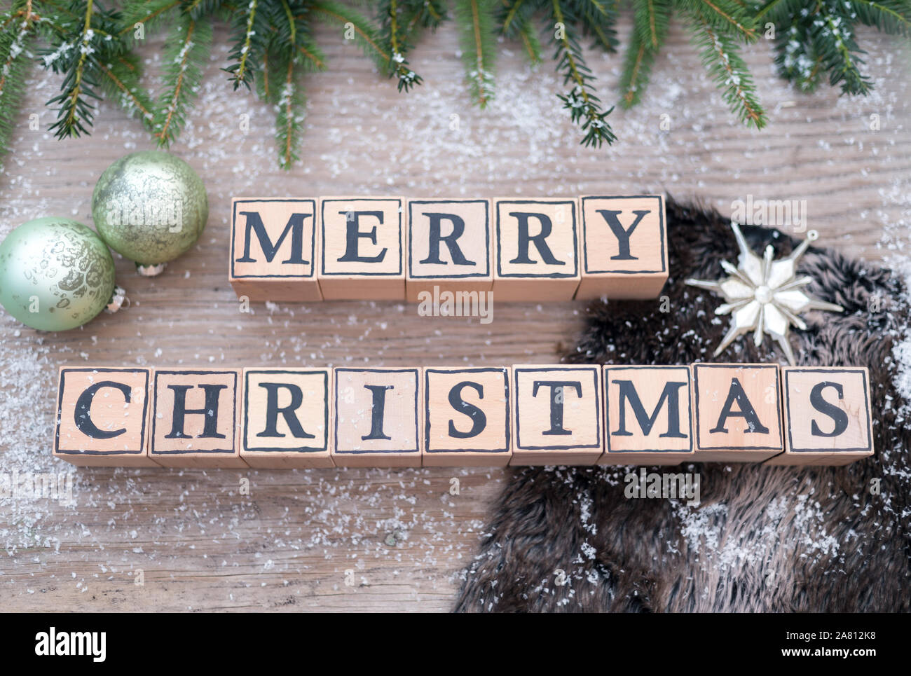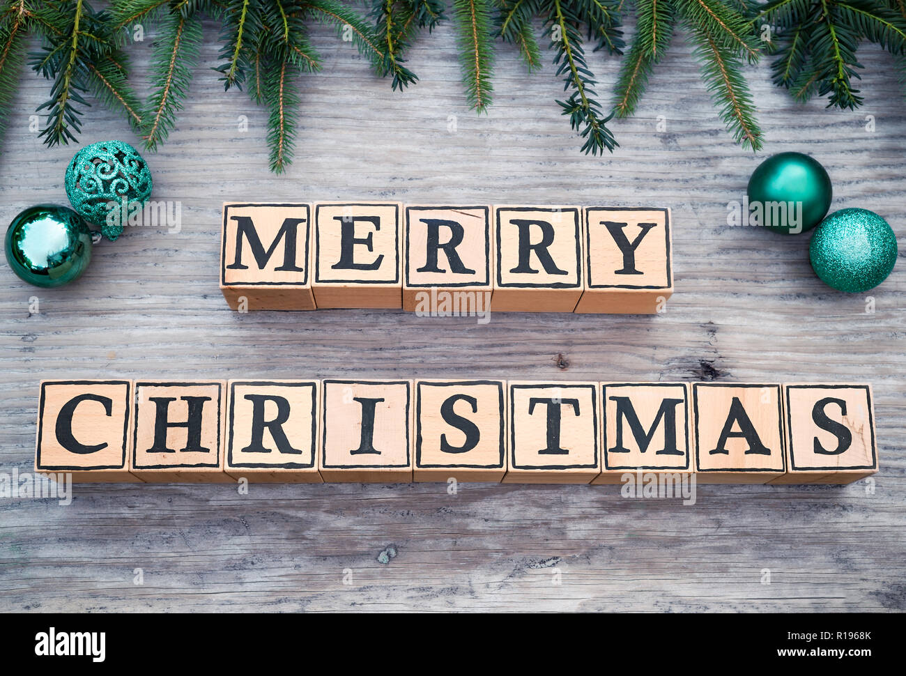 Cubi Di Legno Con Lettere Formano Il Testo Inglese Buon Natale Essi Sono Giacenti Su Un Sfondo Di Legno Rami Di Abeti E Palle Di Natale Sono Accanto Ad Essa Foto Stock