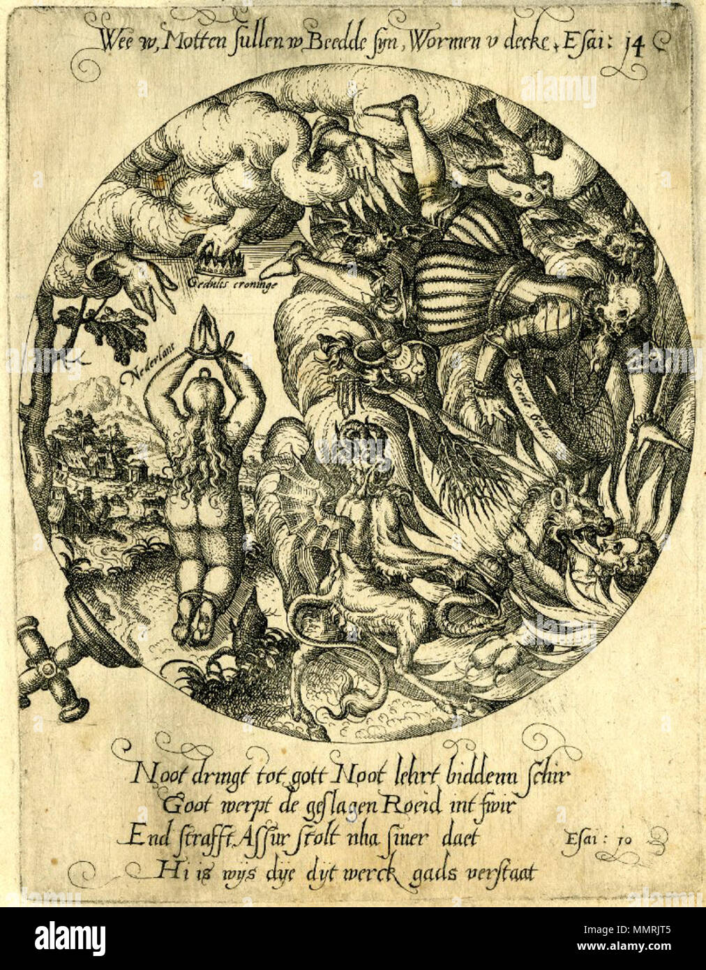 Inglese Stampa Emblematico Downfall Del Oppressori Dei Paesi Bassi La Mano Di Dio Che Appare Dal