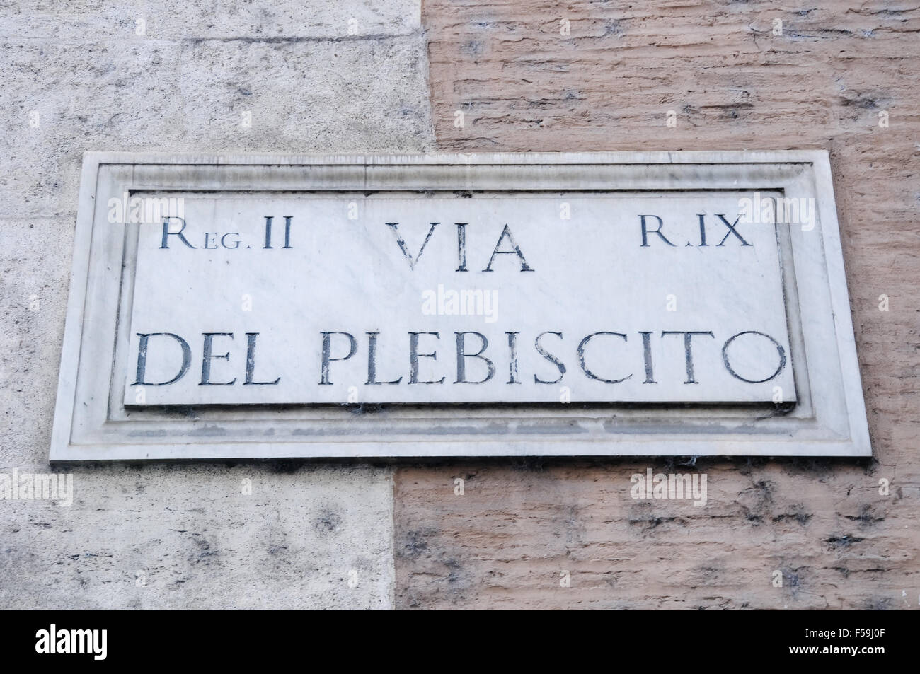 Cartello Stradale Che Indica Il Nome Di Una Strada In Italiano Via Del Plebiscito In Inglese Significa Del Plebiscito Road Roma Foto Stock Alamy