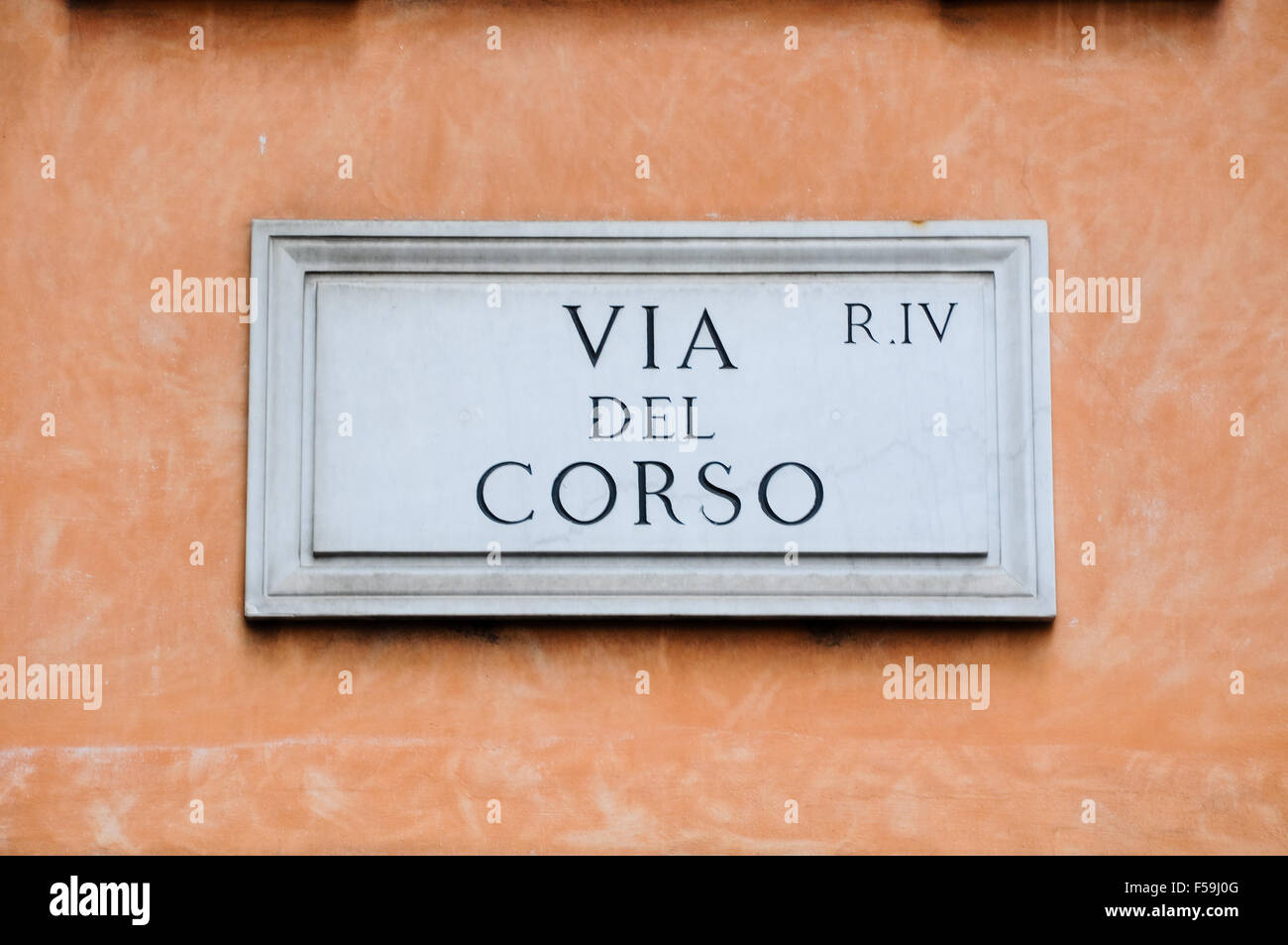 Cartello Stradale Che Indica Il Nome Di Una Strada In Italiano Via Del Corso In Inglese Significa Corso Road Roma Foto Stock Alamy