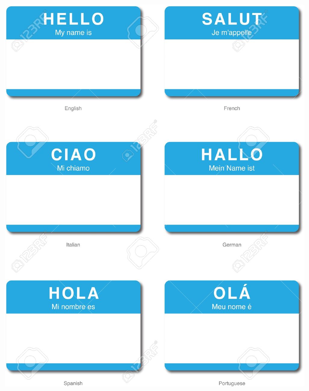Vettoriale Lingua Straniera Di Ciao Il Mio Nome E Adesivo In Inglese Francese Italiano Tedesco Spagnolo Portoghese Image