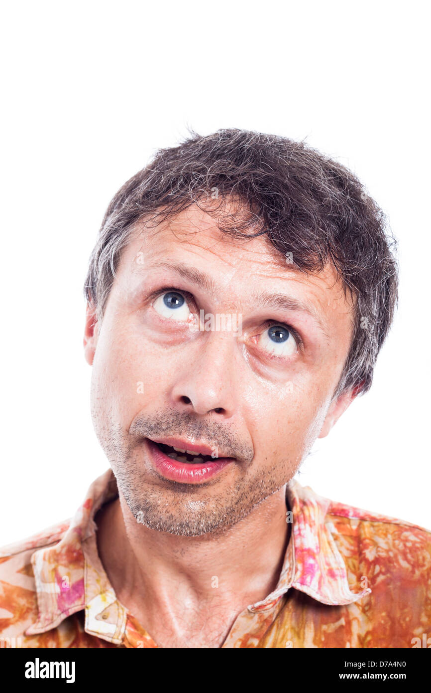 Primo Piano Della Pensieroso Uomo Faccia Guardando In Alto Isolati Su Sfondo Bianco Foto Stock Alamy