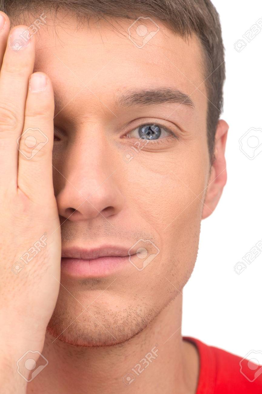Immagini Stock Bel Ragazzo Giovane Su Sfondo Bianco Primo Piano Dell Uomo Che Copre La Meta Del Volto Image