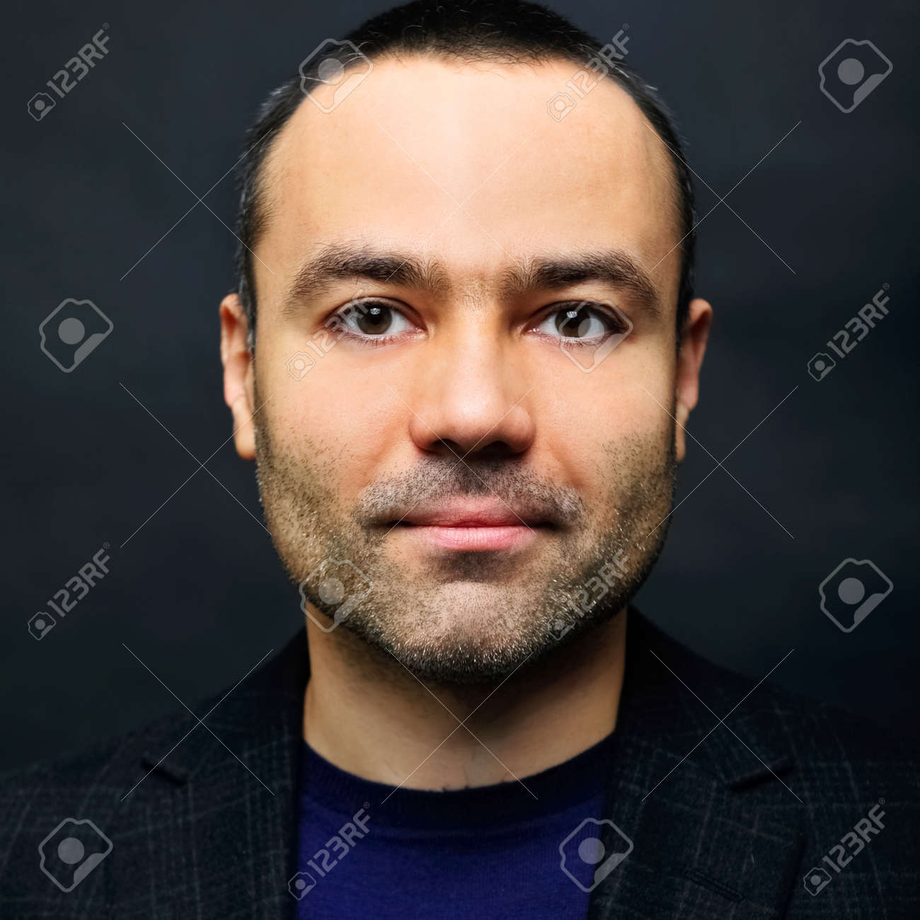 Immagini Stock Primo Piano Immagine Di Un Uomo Di Mezza Eta Felice Su Sfondo Scuro Image