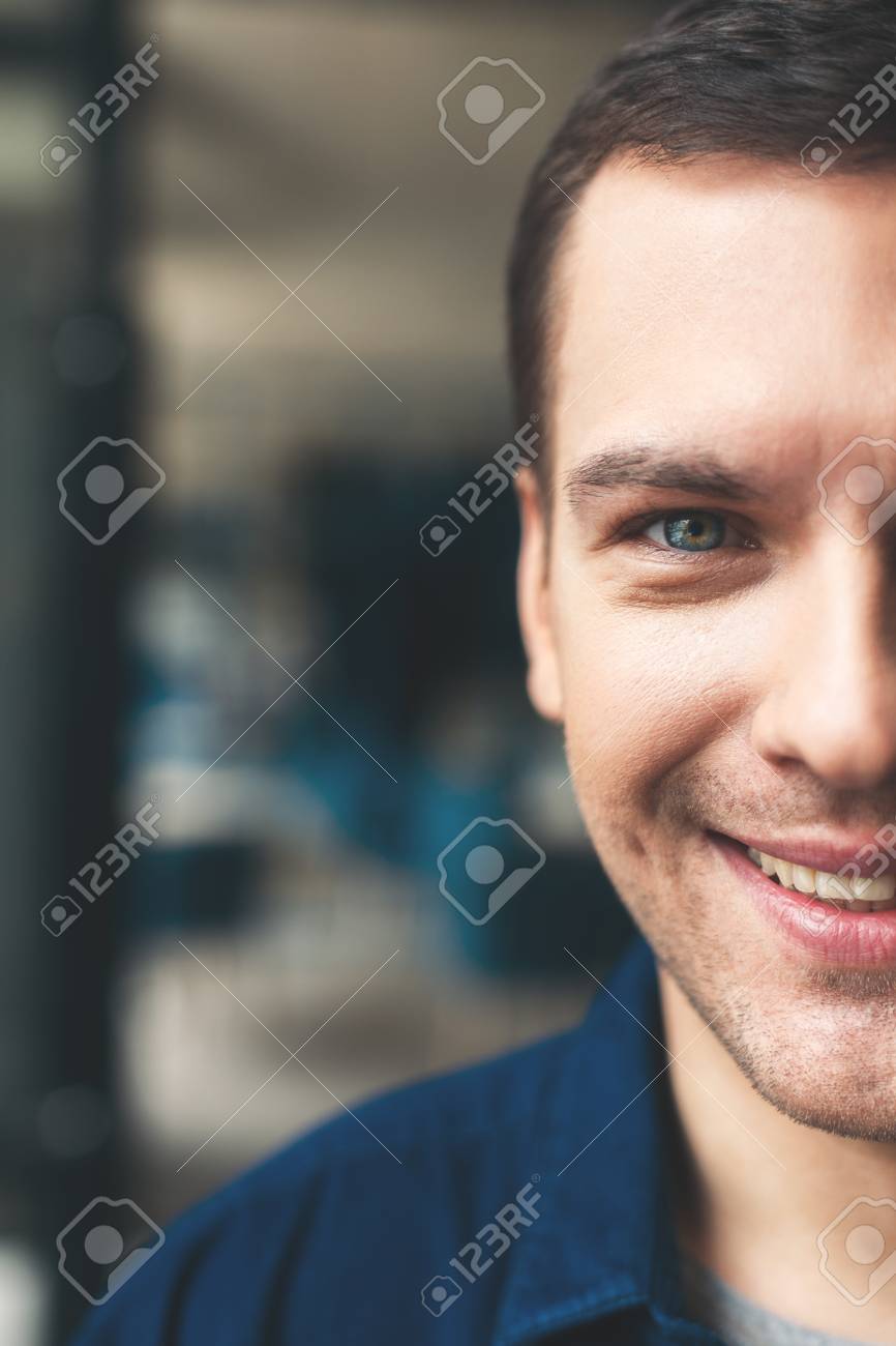 Immagini Stock Primo Piano Della Meta Della Faccia Maschile L Uomo E In Piedi E Sorridente Sta Guardando La Macchina Fotografica Con Felicita Image