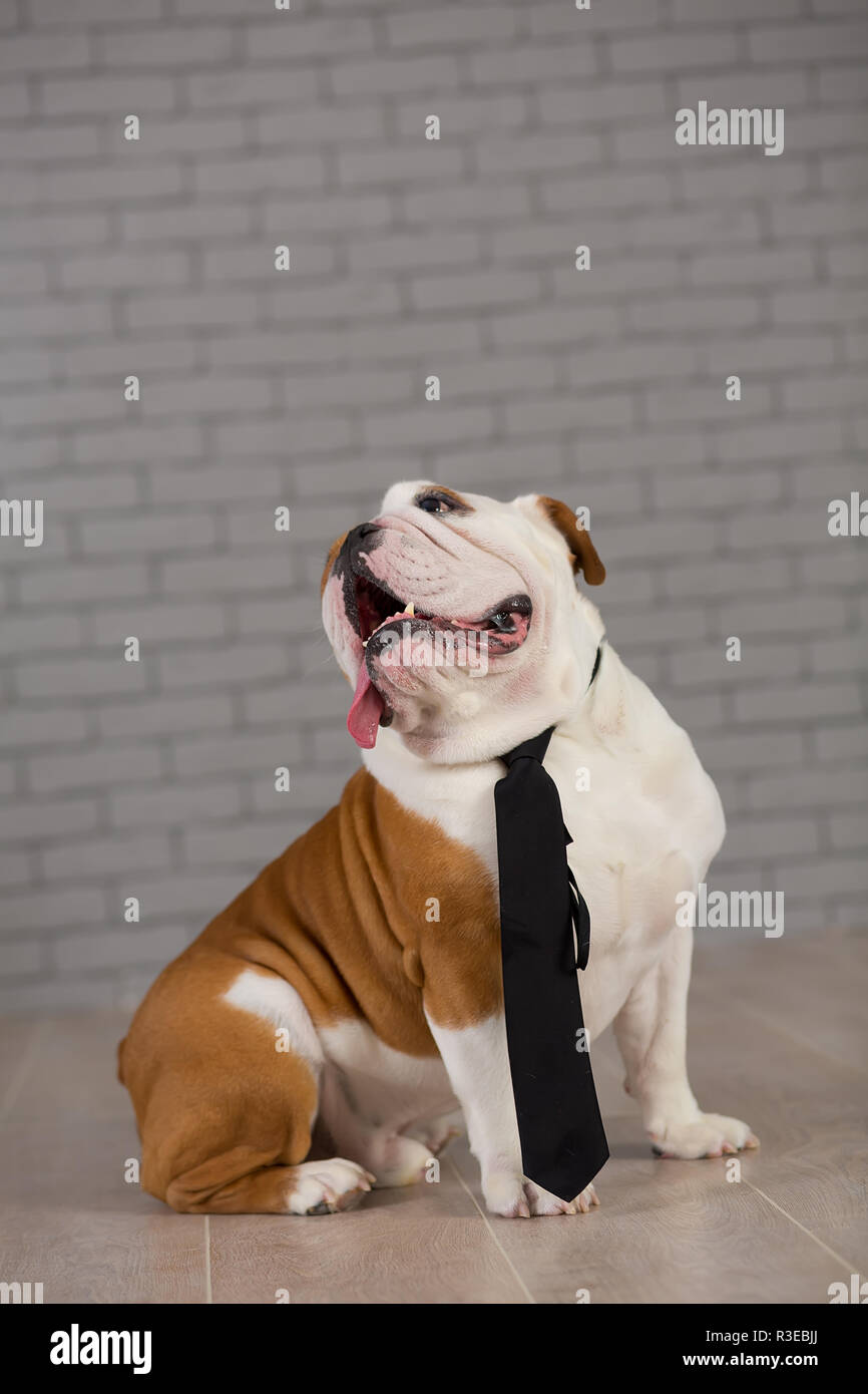Bulldog Inglese Seduta In Business Cravatta In Studio Con Un Muro Di Mattoni Su Sfondo Foto Stock Alamy