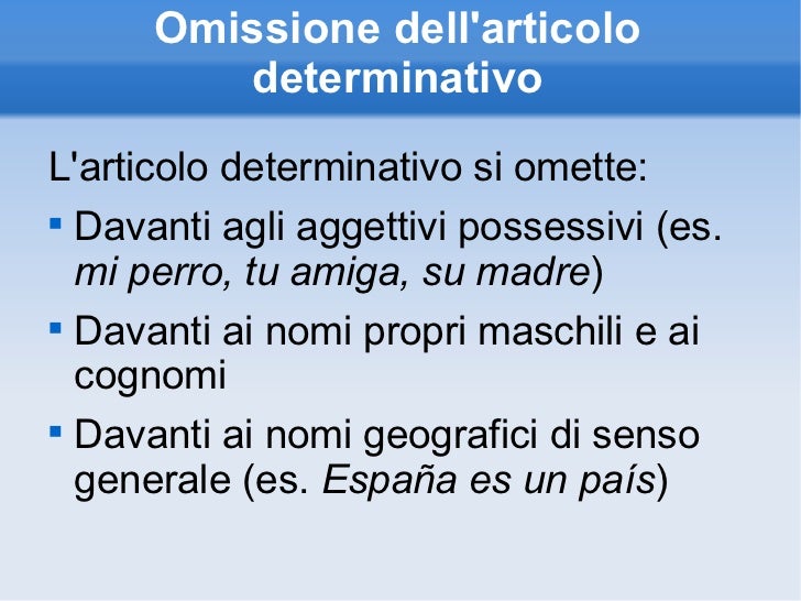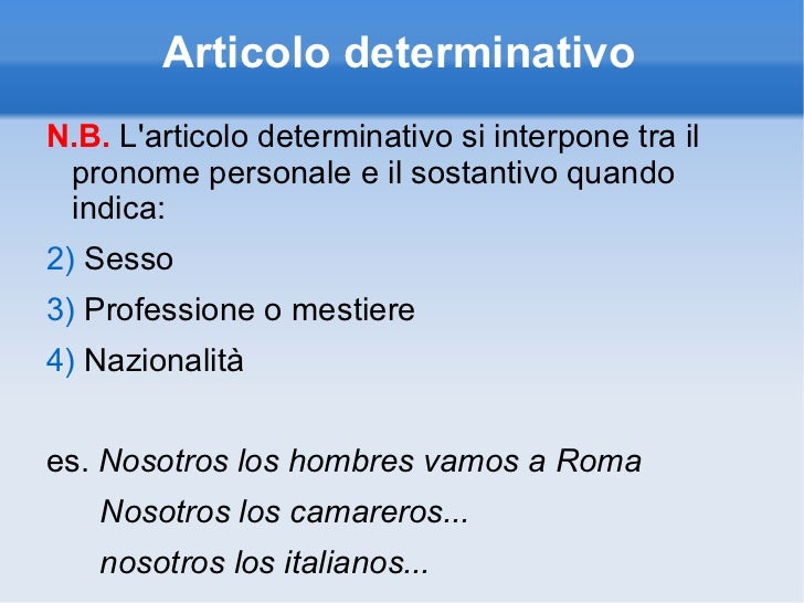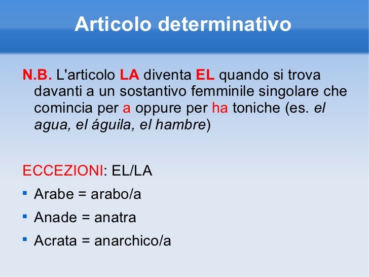Nel caso della lingua inglese il processo si conclude, ma non avverrebbe così per altre lingue come il francese o l'italiano o lo spagnolo, dove l'articolo determinativo presenta un paradigma differenziato a seconda del genere e del numero. La maggior parte del tempo, quando usa l’inglese “il”, la frase corrispondente in spagnolo utilizza l’articolo determinativo Il contrario non è vero;. Corso gratuito di spagnolo per principianti di nonparlospagnolocom Esercizio di spagnolo 101 Gli articoli.