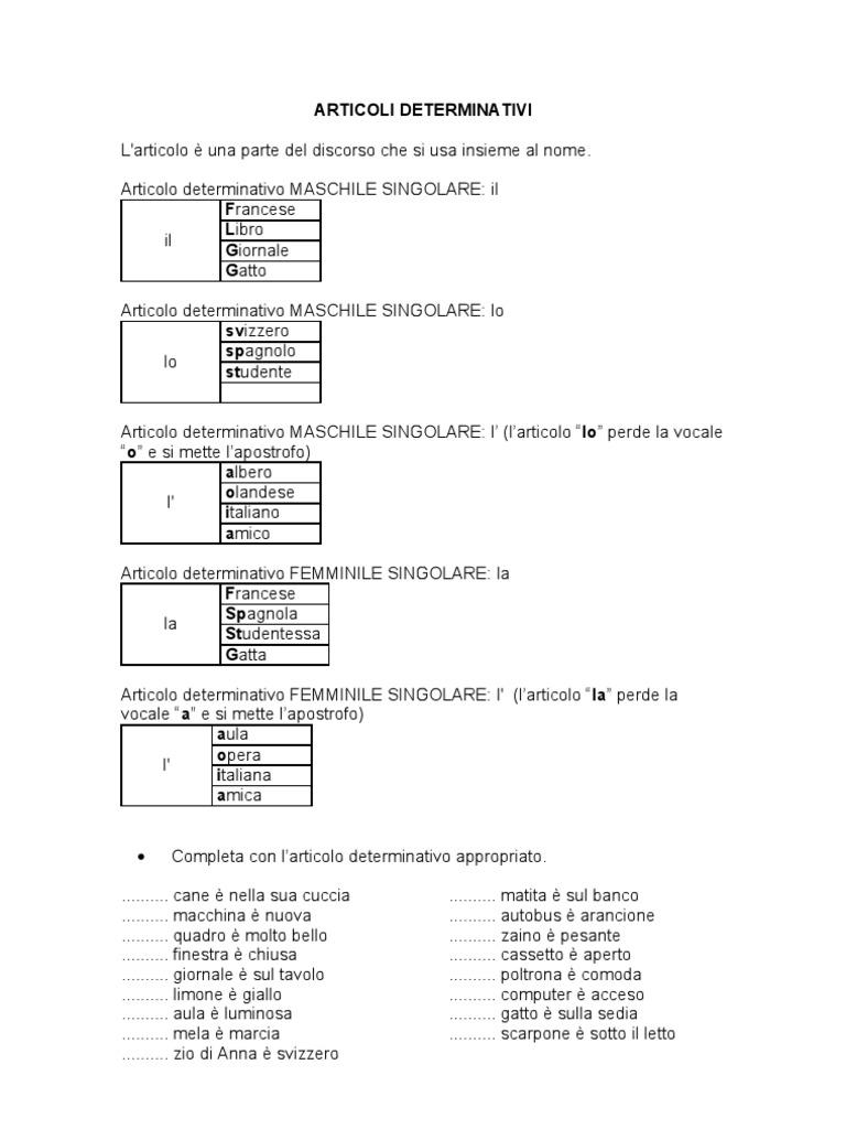 Articolo determinativo spagnolo L'articolo determinativo spagnolo identifica un oggetto ben definito Sono l'equivalente degli articoli italiani il, lo, la, i, gli, le Nella lingua spagnola gli articoli determinativi possono avere un genere maschile, femminile o neutro e possono essere indicati al singolare o al plurale. Articoli determinativi e indeterminativi ( i saluti) e congiunzioni articoli determinativi e indeterminativischemi articoli e congiunzioni esercizi onlinecolby — tre tipi di esercizi e autocorrezione, con spiegazione saluti articoli determinativi e indeterminativi video lezione. Articolo determinativo traduci in inglese con il Dizionario italianoinglese Cambridge Dictionary.