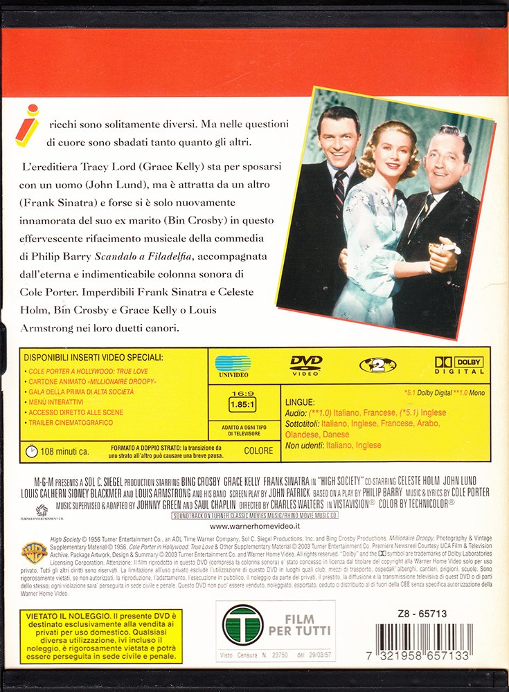 Alta Societa 1 Edizione Italiana Warner Custodia Snapper Amazon It Bing Crosby Grace Kelly Frank Sinatra Celeste Holm John Lund Charles Walters Film E Tv