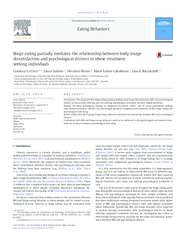 Pdf Binge Eating Partially Mediates The Relationship Between Body Image Dissatisfaction And Psychological Distress In Obese Treatment Seeking Individuals Marie Caltabiano Academia Edu
