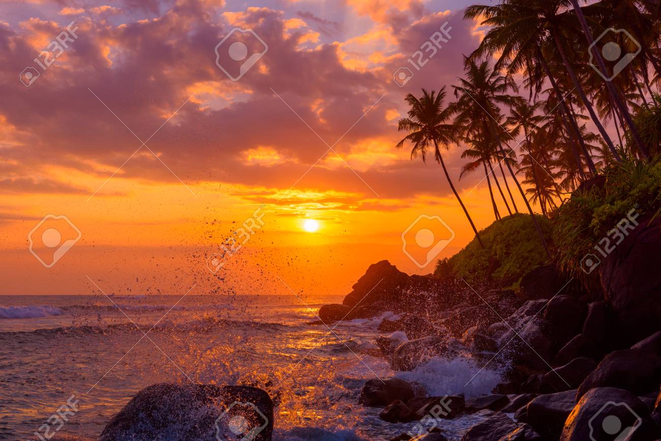 Tropical Sunset Beach With Palm Trees And Rocks With Shiny Golden Stock Photo Picture And Royalty Free Image Image