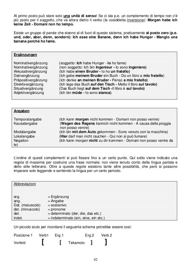 Molte preposizioni in tedesco by jackdelux Molte preposizioni in tedesco Cerca Cerca Chiudi suggerimenti 0% Il 0% ha trovato utile questo documento, Contrassegna questo documento Plurali USA, Niederlande Per dire che vado in questi luoghi (moto a luogo) seguo la regola indicata al punto 1) (luoghi comuni) Per dire che mi trovo/sono. Questo punto è già meno scontato Però pensaci bene è un film, ed almeno che tu non stia guardando Metropolis, film tedesco muto del 1927 (link a Wikipedia in tedesco così ti tieni allenato) le persone dialogano ed interagiscono tra loro, e lo fanno utilizzando spesso umgangssprache, linguaggio colloquiale. Esempi di utilizzo "fino a questo punto" in Tedesco Queste frasi vengono da fonti esterne e potrebbero essere non accurate babla non è responsabile per il loro contenuto Italian Nel 1999, il tasso di adesione al progetto di un'Unione federale era sceso fino a questo punto.