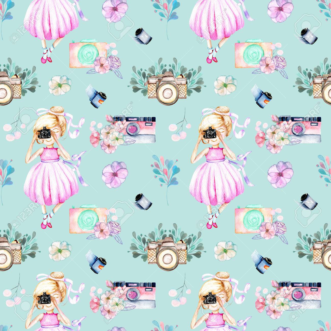 Immagini Stock Seamless Pattern Con Acquerello Ragazza Fotografa Retro Fotocamere E Elementi Floreali Dipinti A Mano Isolato Su Uno Sfondo Blu Image