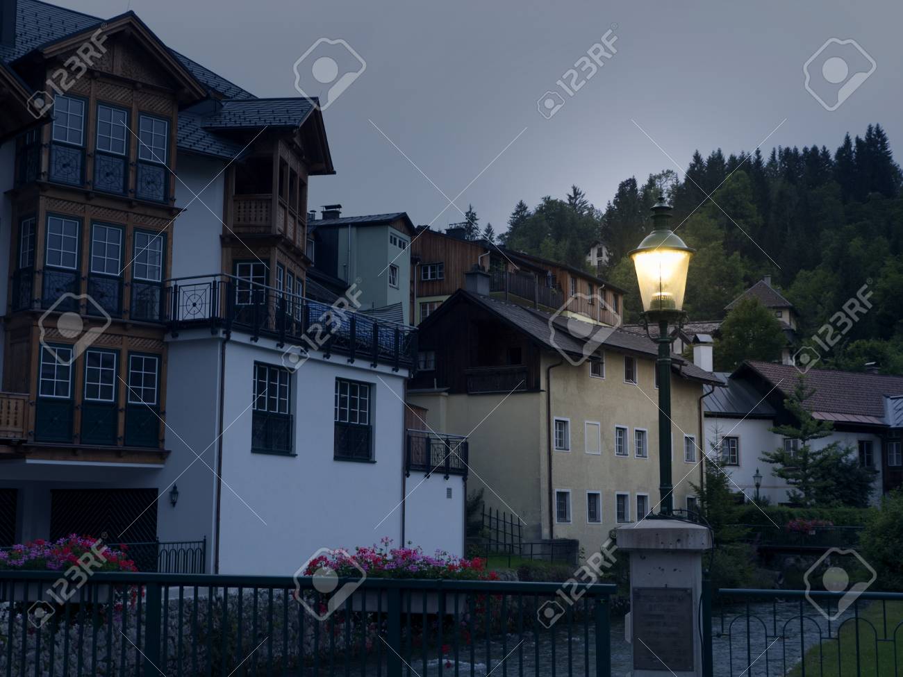 Immagini Stock Citta Notturna Hallstatt Con Lago Di Montagna E Miniere Di Sale Massiccio Alpino Bellissimo Canyon In Austria Salisburgo Alta Valle In Estate Acqua Cristallina Destinazione Per Vacanze Escursioni E