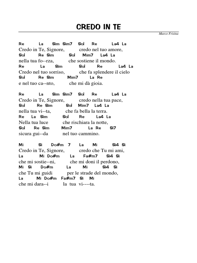 Credo in te, Signore Credo nel tuo amore Nella tua forza Che sostiene il mondo Credo nel tuo sorriso Che fa splendere il cielo E nel tuo canto Che mi dà gioia Credo in te, Signore Credo nella tua pace Nella tua vita Che fa bella la terra Nella tua luce Che rischiara la notte Sicura guida Nel mio cammino Credo in te, Signore Credo che tu mi ami. Per mezzo di lui tutte le cose sono state create Per noi uomini e per la nostra salvezza discese dal cielo,. Credo nel Tuo sorriso, che fa splendere il cielo FA DO LAm REm SOL DO e nel Tuo canto, che mi dà gioia RE LA SIm SOL RE L/LA Credo in Te, Signore, credo nella Tua pace, SOL RE SIm SOL MIm L/LA nella Tua vita, che fa bella la terra.