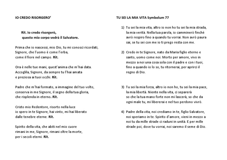 Credo in te signore testo. Nuova statistica quanti Amici di cantoeprego festeggiano il loro compleanno nei vari giorni dell'anno > cantoepregoit > impariamo > gli amici > statistiche > compleanni. E ̑un dì vedrò con gioia ̑e ̑amor le Sue dimore di lassù 4 Credo ̑in Te, Gesù, perfetto sei In Te vivrò il sogno mio;. Credo in te Signore nato da Maria Figlio eterno e santo, uomo come noi Morto per amore vivo in mezzo a noi una cosa sola con il Padre e con i tuoi, fino a quando io lo so tu ritornerai per aprirci il regno di Dio Tu sei la mia forza altro io non ho, Tu sei la mia pace la mia libertà Niente nella vita ci separerà.